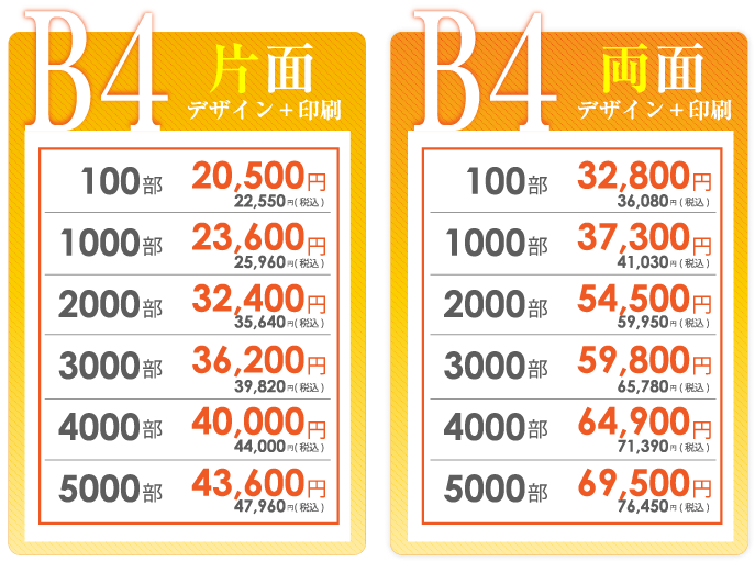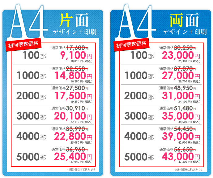 チラシデザイン作成、制作の強み 弊社の一番の強みは、低価格でハイクオリティーなチラシデザインの作成です。一般的な地元山口のデザイン会社ですと、チラシデザイン代片面で3万~4万が相場だと思います。 確かに安い業者はあるのですが、クオリティー的にプロとは言えないレベルのデザインの作成をし、一万円以下で販売もしている業者もいますが、対応のスピードや作品の質に疑問を感じます。山口チラシ作成.comではデザイナー全員が数年間の実務経験を経験しているデザイナーを多数抱えている為、低価格でのデザイン制作が可能になりました。 制作依頼前にラフデザインをご依頼者様に提出する為、お客様のイメージにより近いチラシのデザインを作成しております。よくお会いしてチラシデザインの打ち合わせをしたいというお客様もいらっしゃいますが、弊社は低価格での提供を考えておりますのでやり取りは、電話やメール、FAXなどで対応しております。また、 修正などもお客様がご納得していただくまで、何度でもチラシデザインの修正を承っております。 続いて、チラシデザインの制作スピードに関しましても、最短で当日・翌日仕上げの特急便、2~3日で完成するお急ぎ便の2種類をご用意しております。 チラシデザインの特急便はA4サイズの場合、片面34000円~でお受けしております。チラシデザインのお急ぎ便は片面25500円~でお受けしております。お急ぎの場合は、是非弊社の担当者までお気軽にお問合せいただければ幸いです。 スピードを求めないのでしたら、弊社で1番のお勧めはチラシ印刷パックをオススメしております。一番安いプランですと、チラシデザイン+印刷でA6サイズ100枚で税抜5980円からオススメしております。A4サイズでの最安パックは、チラシデザイン+印刷+送料込みで100枚で9,100円でお受けしております。 また他に何かわからないことがございましたらなんなりとお気軽にお問合せください。
