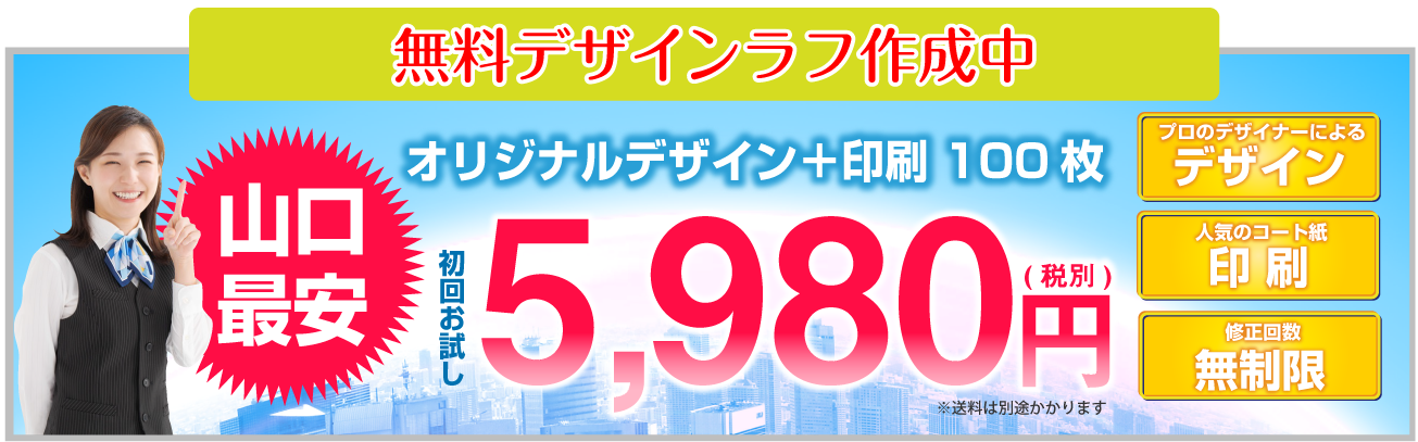 チラシデザイン作成、制作の強み 弊社の一番の強みは、低価格でハイクオリティーなチラシデザインの作成です。一般的な地元山口のデザイン会社ですと、チラシデザイン代片面で3万~4万が相場だと思います。 確かに安い業者はあるのですが、クオリティー的にプロとは言えないレベルのデザインの作成をし、一万円以下で販売もしている業者もいますが、対応のスピードや作品の質に疑問を感じます。山口チラシ作成.comではデザイナー全員が数年間の実務経験を経験しているデザイナーを多数抱えている為、低価格でのデザイン制作が可能になりました。 制作依頼前にラフデザインをご依頼者様に提出する為、お客様のイメージにより近いチラシのデザインを作成しております。よくお会いしてチラシデザインの打ち合わせをしたいというお客様もいらっしゃいますが、弊社は低価格での提供を考えておりますのでやり取りは、電話やメール、FAXなどで対応しております。また、 修正などもお客様がご納得していただくまで、何度でもチラシデザインの修正を承っております。 続いて、チラシデザインの制作スピードに関しましても、最短で当日・翌日仕上げの特急便、2~3日で完成するお急ぎ便の2種類をご用意しております。 チラシデザインの特急便はA4サイズの場合、片面34000円~でお受けしております。チラシデザインのお急ぎ便は片面25500円~でお受けしております。お急ぎの場合は、是非弊社の担当者までお気軽にお問合せいただければ幸いです。 スピードを求めないのでしたら、弊社で1番のお勧めはチラシ印刷パックをオススメしております。一番安いプランですと、チラシデザイン+印刷でA6サイズ100枚で税抜5980円からオススメしております。A4サイズでの最安パックは、チラシデザイン+印刷+送料込みで100枚で9,100円でお受けしております。 また他に何かわからないことがございましたらなんなりとお気軽にお問合せください。