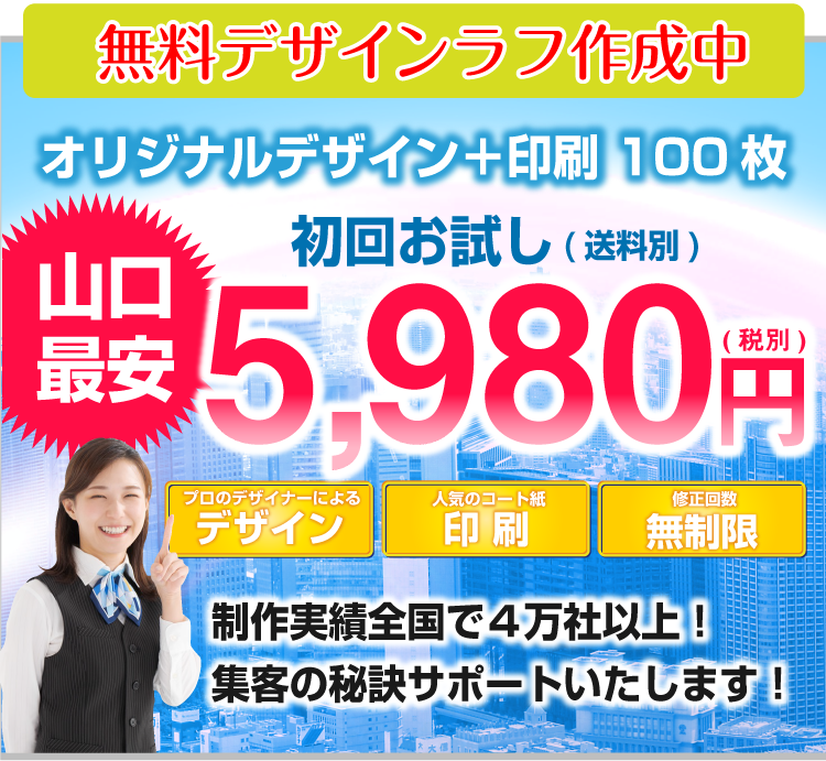 チラシデザイン+印刷で、税抜5980円山口県下最安値に挑戦!!チラシお急ぎ納期OK最短納期当日仕上げ対応中!! 山口県下同業他社より1円でも高い場合はご相談ください!!誠心誠意対応させて頂きます。チラシのことなら山口チラシ作成.com!